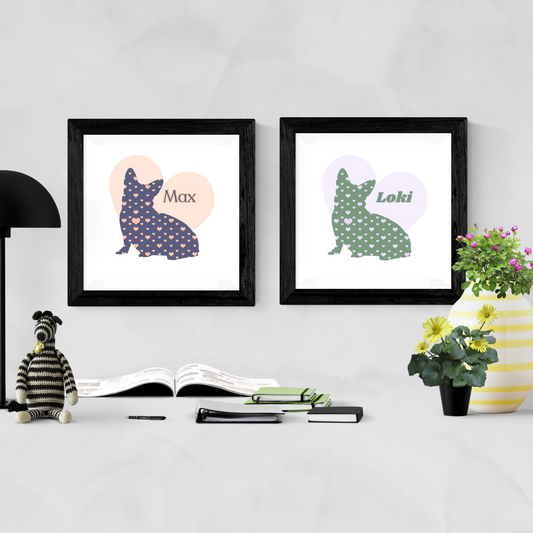 Corgi Dog Silhouette filled with Hearts, Customized to include pet name and quote, Great for a Dog Lover, Dog Artwork, and Dog Loss Tribute