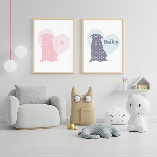 Pug Dog Silhouette filled with Hearts, Customized to include pet name and quote, Great for a Dog Lover, Dog Artwork, and Dog Loss Tribute