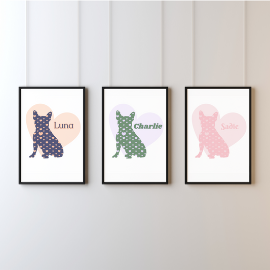 Frenchie Dog Silhouette filled with Hearts, Customized to include pet name and quote, Great for a Dog Lover, Dog Artwork, and Dog Loss Tribute