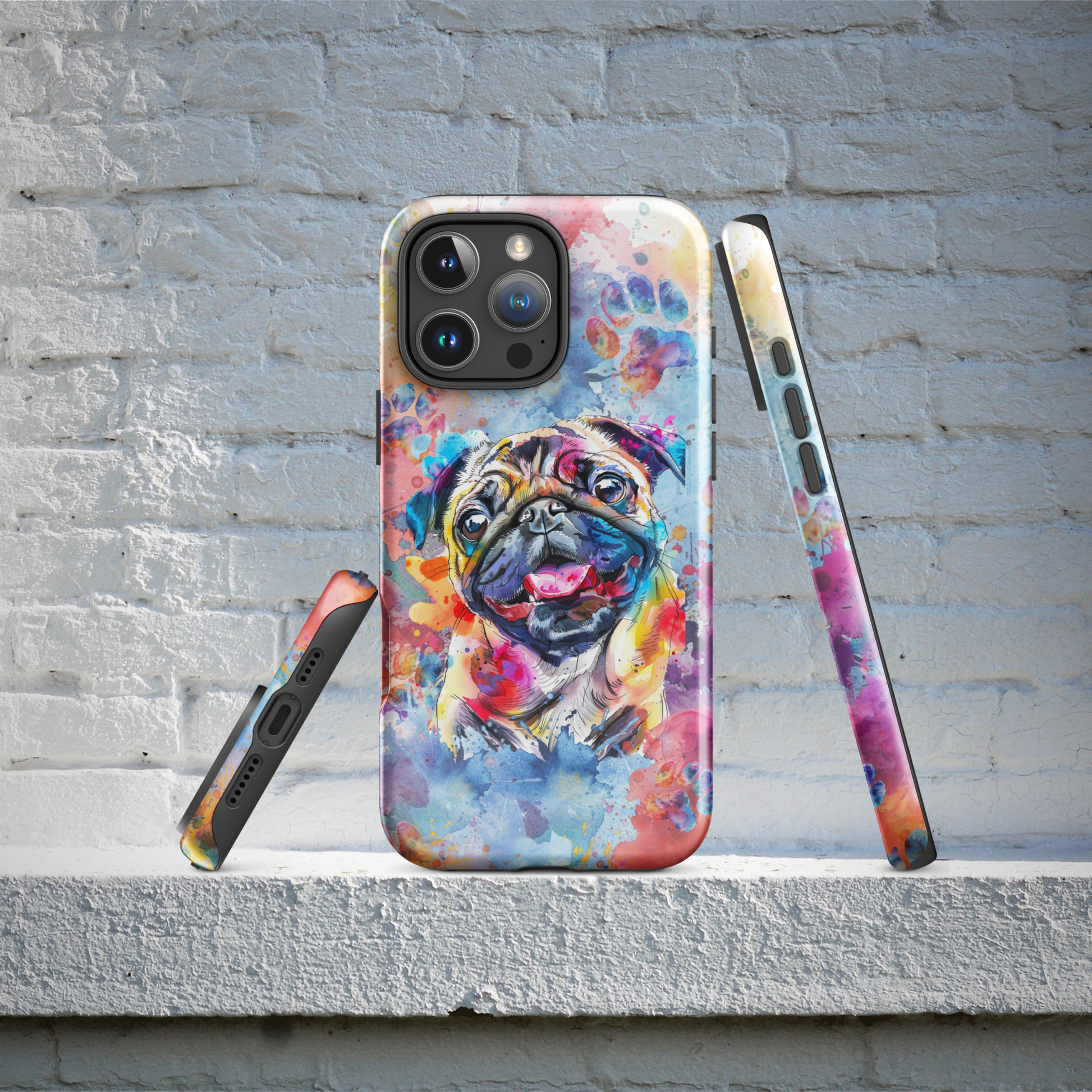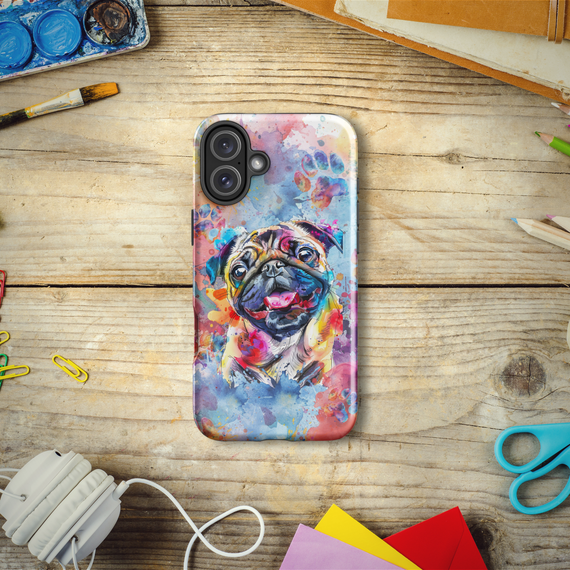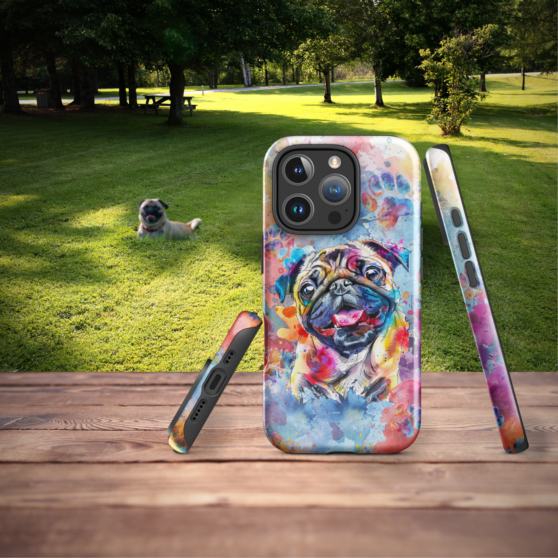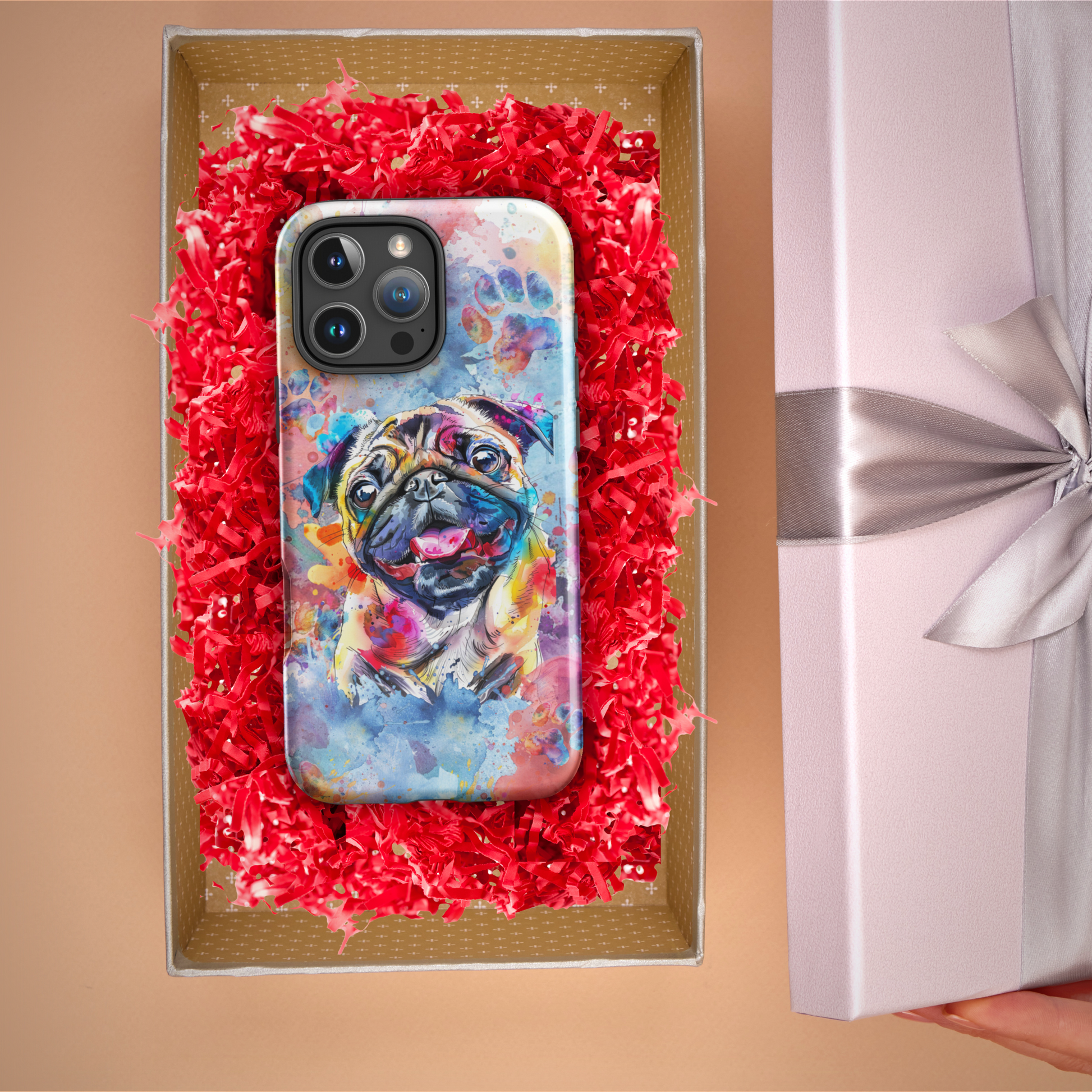Artful Design: A happy Pug in watercolor, complemented by vibrant watercolor splashes, transforms your phone into a portable masterpiece.