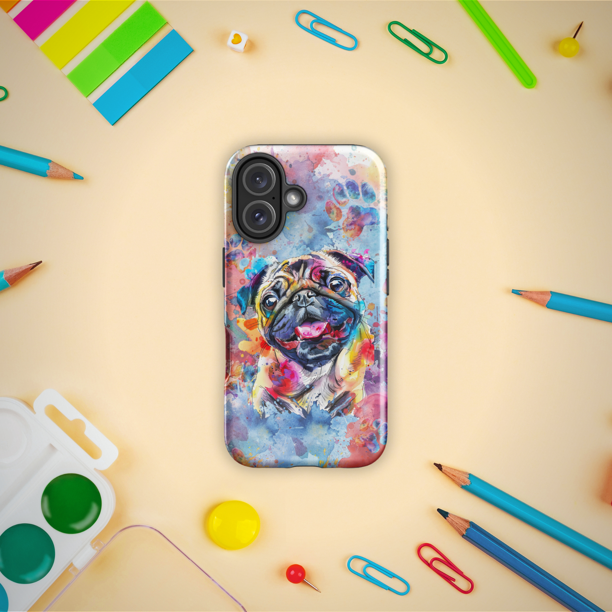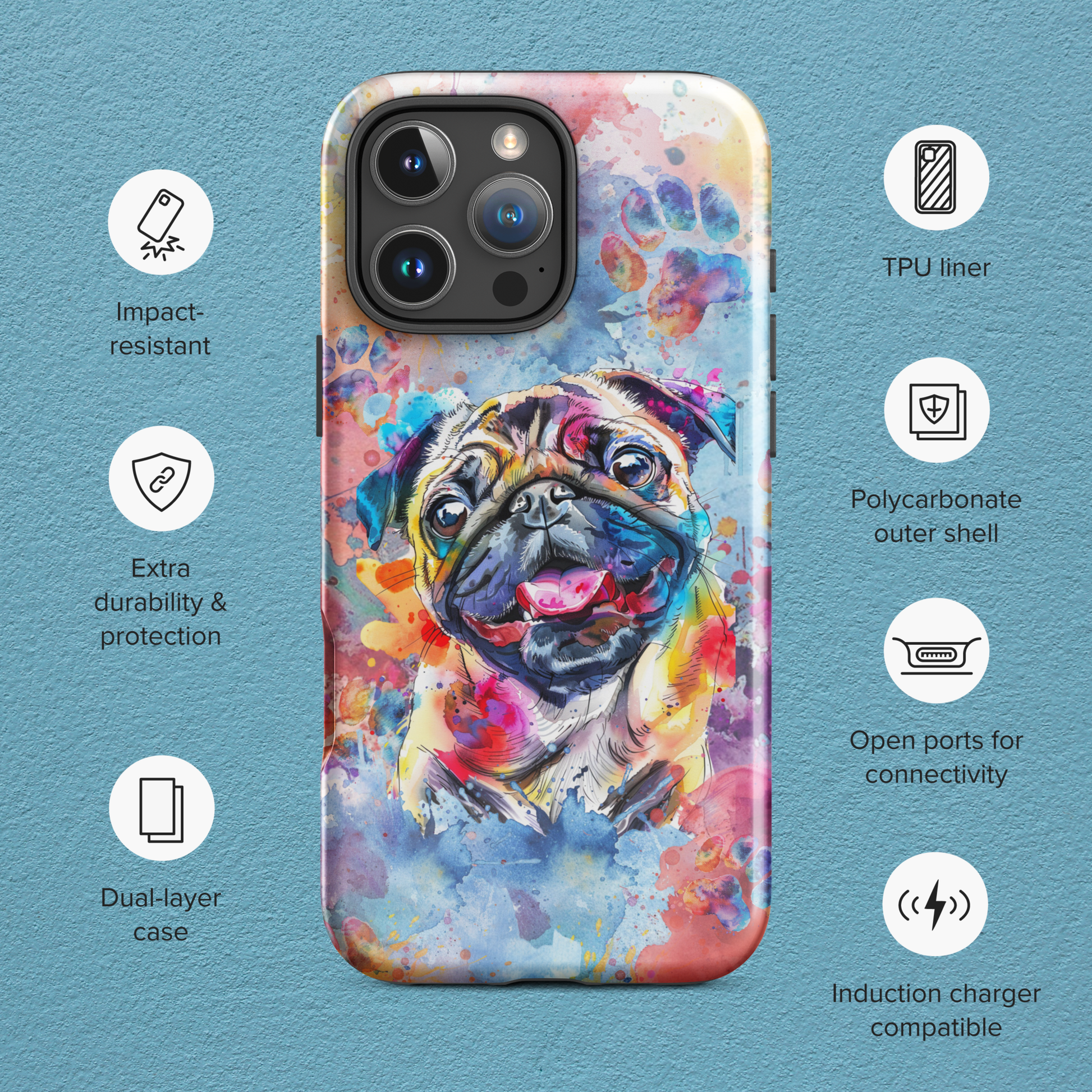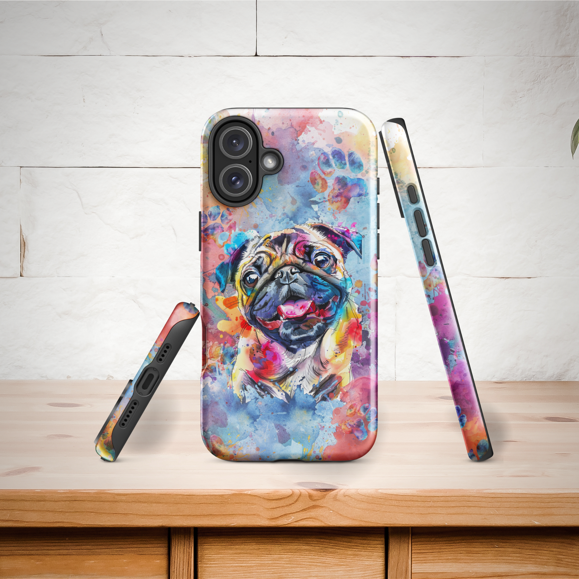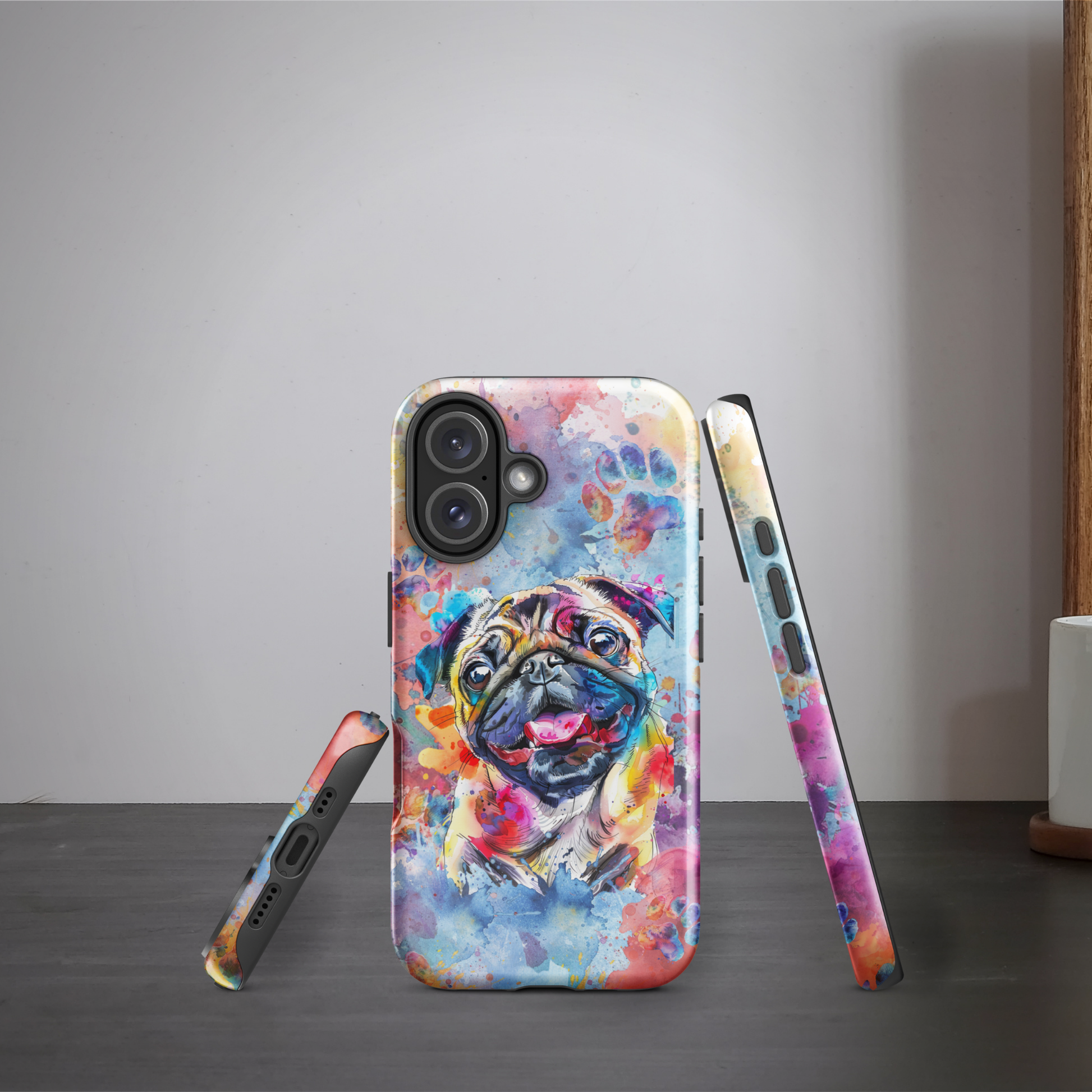 Artful Design: A happy Pug in watercolor, complemented by vibrant watercolor splashes, transforms your phone into a portable masterpiece.